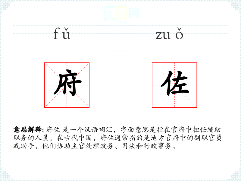 府佐 是一个汉语词汇,字面意思是指在官府中担任辅助职务的人员。在古代**,府佐通常指的是地方官府中的副职官员或助手,他们协助主官处理政务、司法和行政事务。