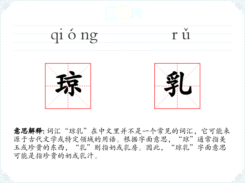 词汇“琼乳”在中文里并不是一个常见的词汇,它可能来源于古代文学或特定领域的用语。根据字面意思,“琼”通常指美玉或珍贵的东西,“乳”则指奶或乳房。因此,“琼乳”字面意思可能是指珍贵的奶或乳汁。