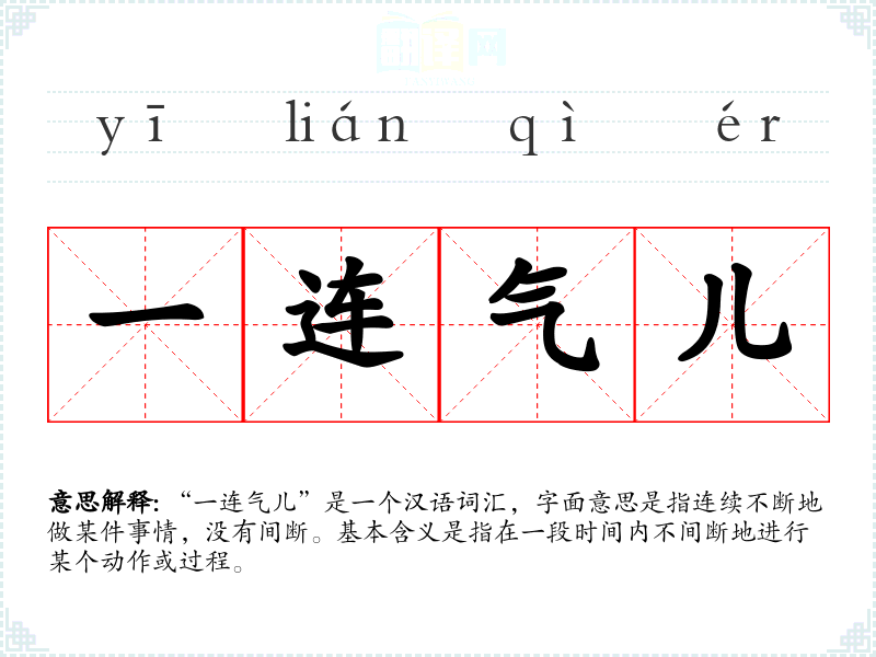 “一连气儿”是一个汉语词汇,字面意思是指连续不断地做某件事情,没有间断。基本含义是指在一段时间内不间断地进行某个动作或过程。