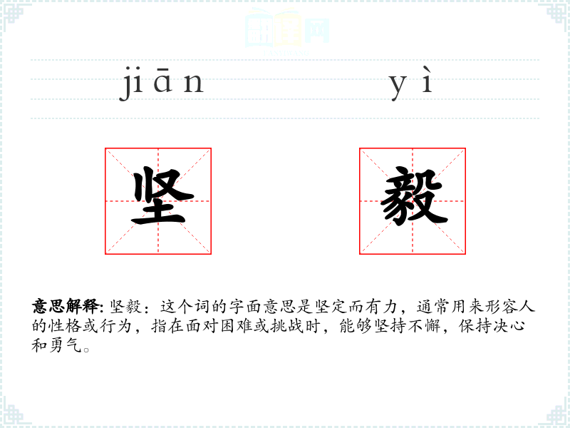坚毅:这个词的字面意思是坚定而有力,通常用来形容人的性格或行为,指在面对困难或挑战时,能够坚持不懈,保持决心和勇气。