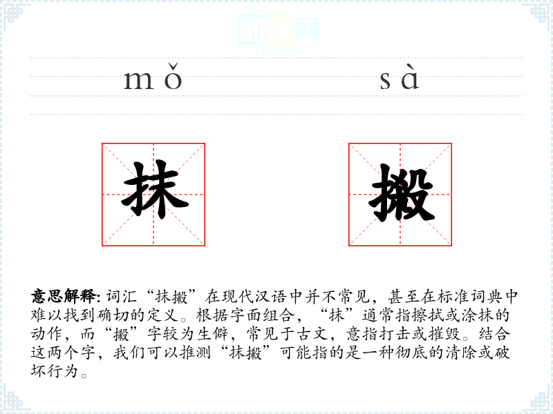 “抹”字源自古代的擦拭动作,而“摋”字则源自古代的打击动作。这两个字的结合可能是后来文学创作中的产物,用以强调动作的彻底性。