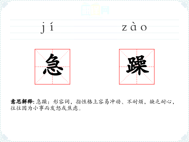 急躁:形容词,指性格上容易冲动、不耐烦,缺乏耐心,往往因为小事而发怒或焦虑。