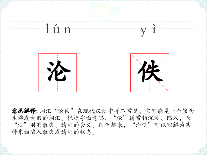 词汇“沦佚”在现代汉语中并不常见,它可能是一个较为生僻或古旧的词汇。根据字面意思,“沦”通常指沉没、陷入,而“佚”则有散失、遗失的含义。结合起来,“沦佚”可以理解为某种东西陷入散失或遗失的状态。