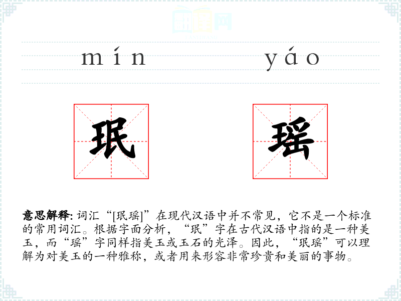 - “珉”和“瑶”都是古代汉语中对玉石的美称,随着时间的推移,这些词汇的使用频率降低,但在特定的文学和艺术领域仍然保留其独特的韵味。
