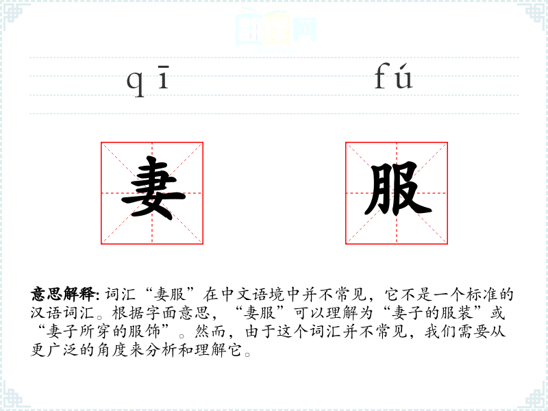 “妻服”字面意思是指妻子所穿的服装。在现代汉语中,这个词汇并不常用,通常我们会直接说“妻子的衣服”或“妻子的服饰”。