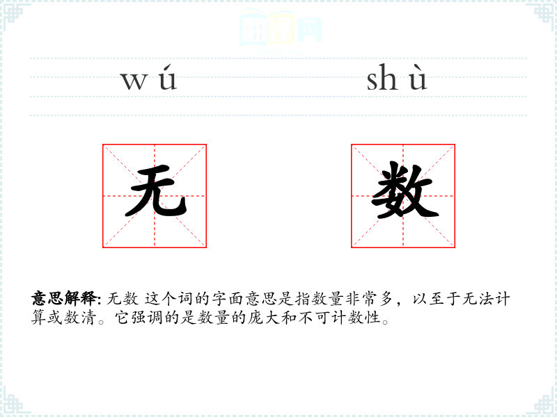 无数 这个词的字面意思是指数量非常多,以至于无法计算或数清。它强调的是数量的庞大和不可计数性。