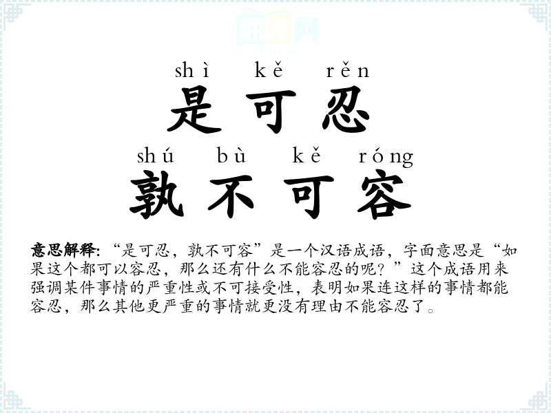 “是可忍,孰不可容”是一个汉语成语,字面意思是“如果这个都可以容忍,那么还有什么不能容忍的呢?”这个成语用来强调某件事情的严重性或不可接受性,表明如果连这样的事情都能容忍,那么其他更严重的事情就更没有理由不能容忍了。