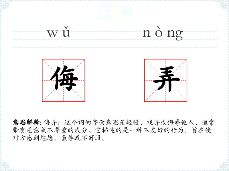 侮弄:这个词的字面意思是轻慢、戏弄或侮辱他人,通常带有恶意或不尊重的成分。它描述的是一种不友好的行为,旨在使对方感到尴尬、羞辱或不舒服。