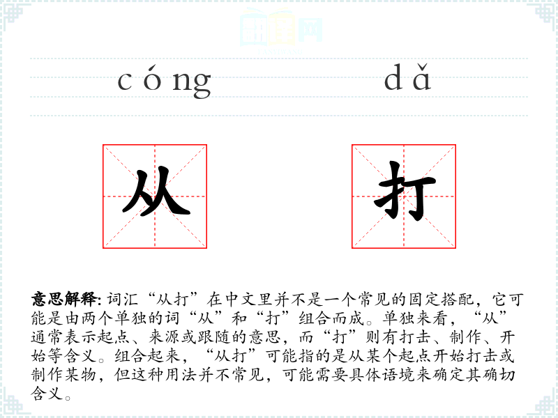 “从打”不是一个常用词汇,它的使用需要具体语境来确定含义。在语言学*和表达中,了解这种词汇的用法可以帮助我们更准确地理解和使用中文。尽管它在日常交流中不常见,但在特定的文学或专业领域中,它可能会有其独特的表达效果。