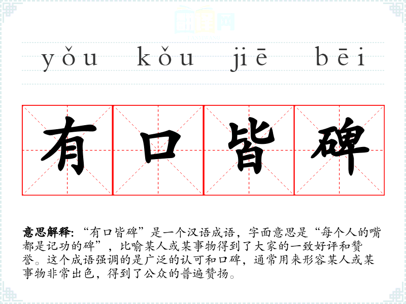 “有口皆碑”是一个汉语成语,字面意思是“每个人的嘴都是记功的碑”,比喻某人或某事物得到了大家的一致好评和赞誉。这个成语强调的是广泛的认可和口碑,通常用来形容某人或某事物非常出色,得到了公众的普遍赞扬。