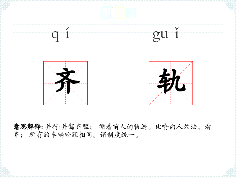 ; 循着前人的轨迹。比喻向人效法,看齐; 所有的车辆轮距相同。谓制度统一。