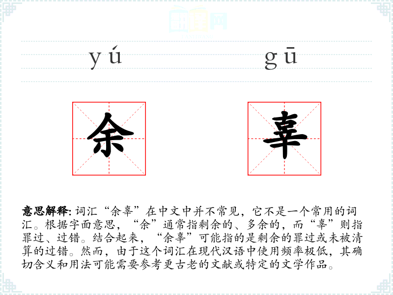 总的来说,“余辜”是一个具有特定历史和文化背景的词汇,虽然在现代汉语中不常用,但对于理解古代汉语和文学有一定的价值。