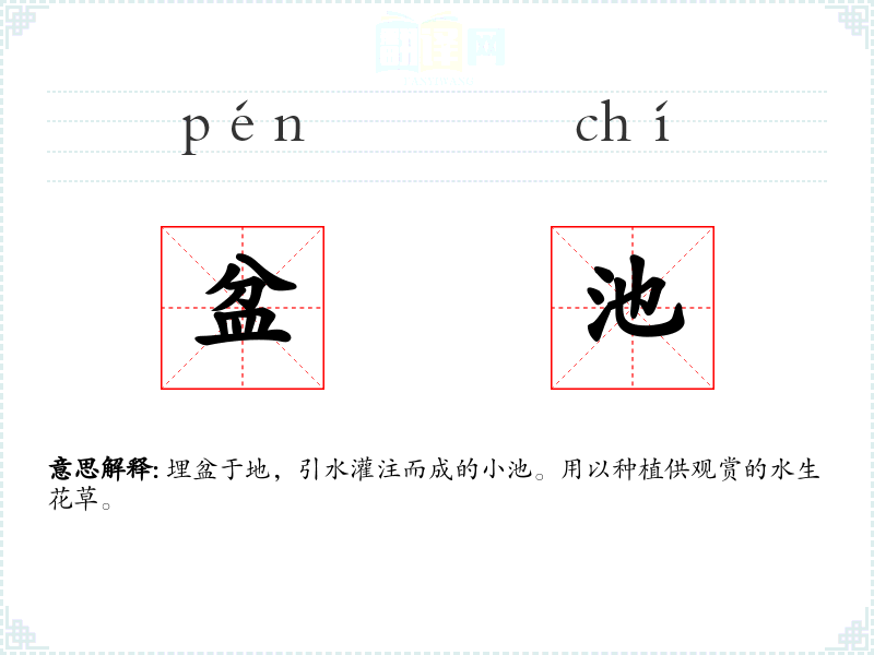 埋盆于地,引水灌注而成的小池。用以种植供观赏的水生花草。