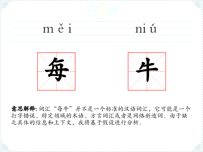 词汇“每牛”并不是一个标准的汉语词汇,它可能是一个打字错误、特定领域的术语、方言词汇或者是网络新造词。由于缺乏具体的信息和上下文,我将基于假设进行分析。