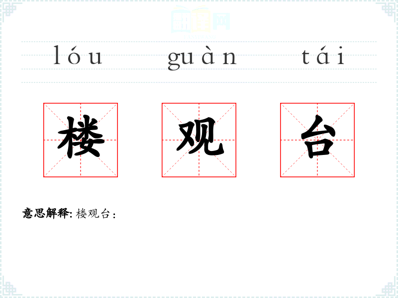 - 字面意思:楼观台通常指的是一种建筑结构,它是一个高台或平台,通常建在高处,用于观察或观赏周围的景色。