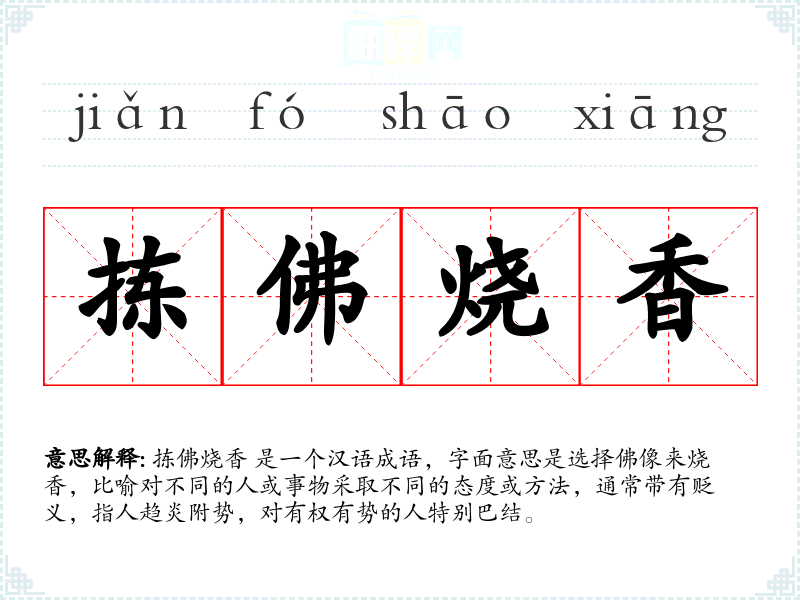 拣佛烧香 是一个汉语成语,字面意思是选择佛像来烧香,比喻对不同的人或事物采取不同的态度或方法,通常带有贬义,指人趋炎附势,对有权有势的人特别巴结。