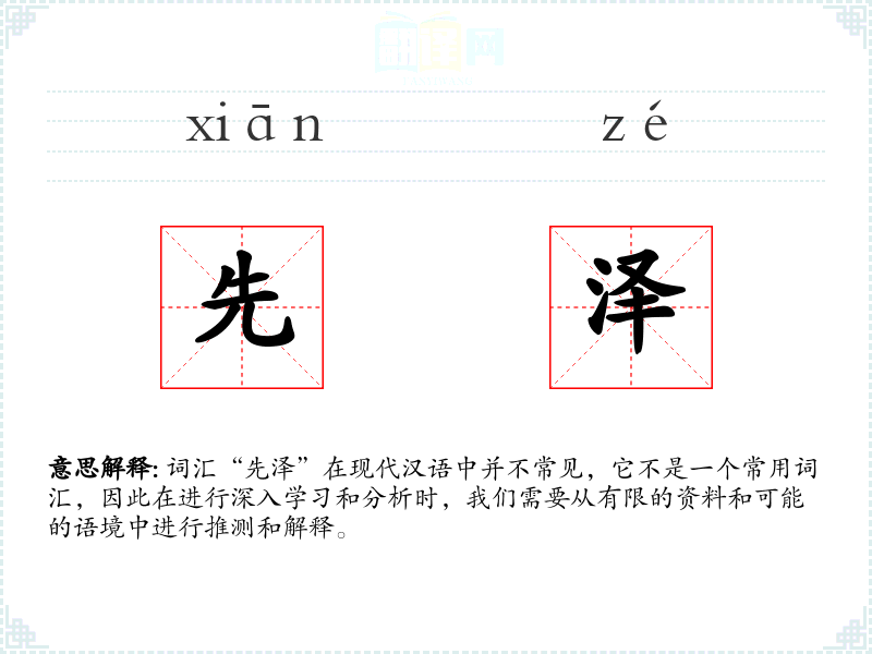 词汇“先泽”在现代汉语中并不常见,它不是一个常用词汇,因此在进行深入学*和分析时,我们需要从有限的资料和可能的语境中进行推测和解释。