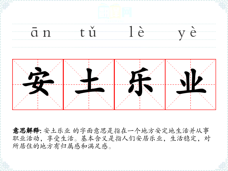 安土乐业 的字面意思是指在一个地方安定地生活并从事职业活动,享受生活。基本含义是指人们安居乐业,生活稳定,对所居住的地方有归属感和满足感。