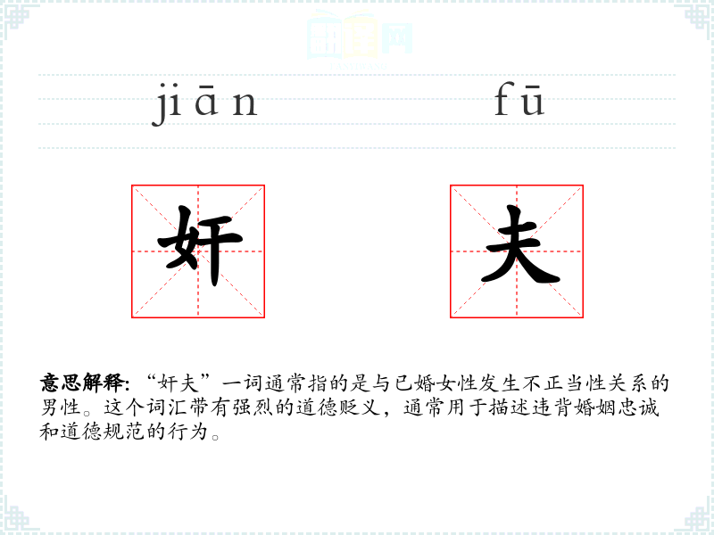 “奸夫”一词通常指的是与已婚女性发生不正当性关系的男性。这个词汇带有强烈的道德贬义,通常用于描述违背婚姻忠诚和道德规范的行为。