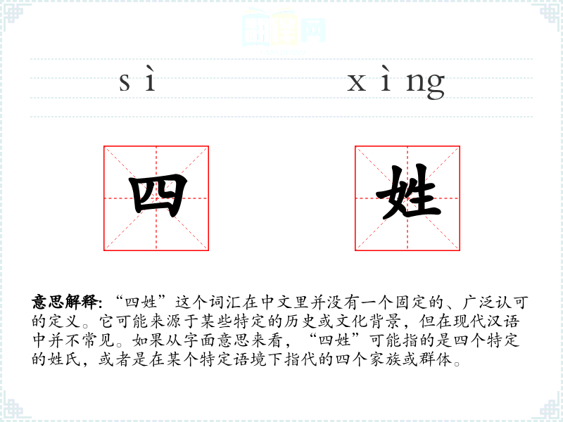 “四姓”这个词汇在中文里并没有一个固定的、广泛认可的定义。它可能来源于某些特定的历史或文化背景,但在现代汉语中并不常见。如果从字面意思来看,“四姓”可能指的是四个特定的姓氏,或者是在某个特定语境下指代的四个家族或群体。