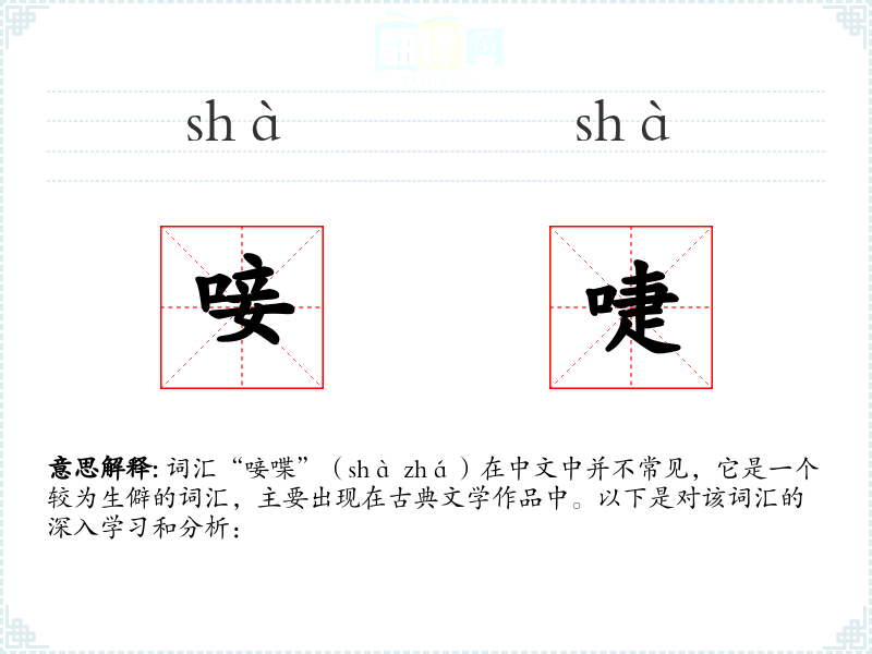 词汇“唼喋”(shà zhá)在中文中并不常见,它是一个较为生僻的词汇,主要出现在古典文学作品中。以下是对该词汇的深入学*和分析: