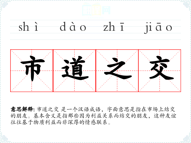 市道之交 是一个汉语成语,字面意思是指在市场上结交的朋友。基本含义是指那些因为利益关系而结交的朋友,这种友谊往往基于物质利益而非深厚的情感联系。
