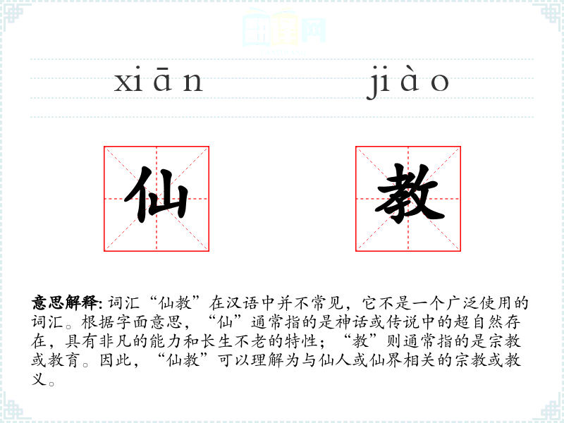 - 词源:“仙”源自古代对超自然存在的崇拜,“教”则源自**或教育体系的概念。