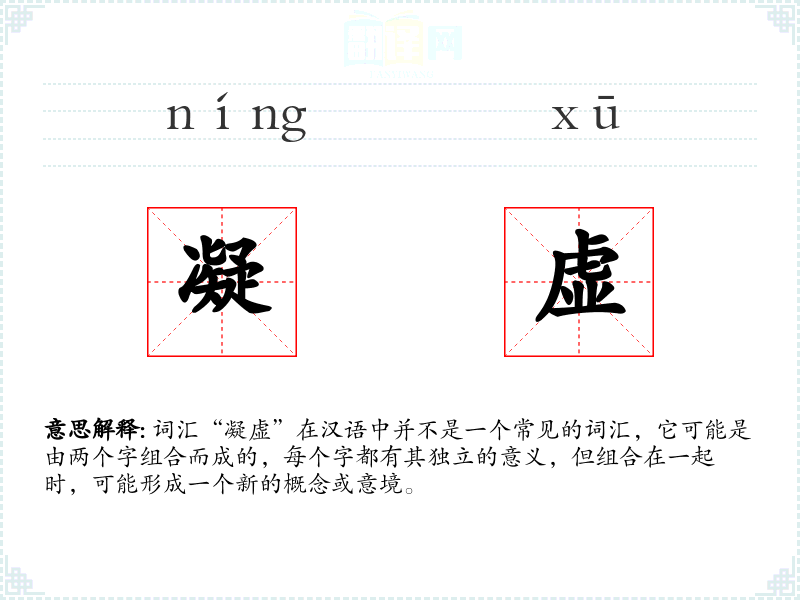 词汇“凝虚”在汉语中并不是一个常见的词汇,它可能是由两个字组合而成的,每个字都有其独立的意义,但组合在一起时,可能形成一个新的概念或意境。