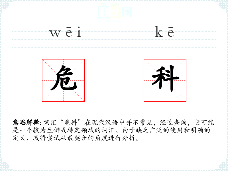 词汇“危科”在现代汉语中并不常见,经过查询,它可能是一个较为生僻或特定领域的词汇。由于缺乏广泛的使用和明确的定义,我将尝试从最契合的角度进行分析。