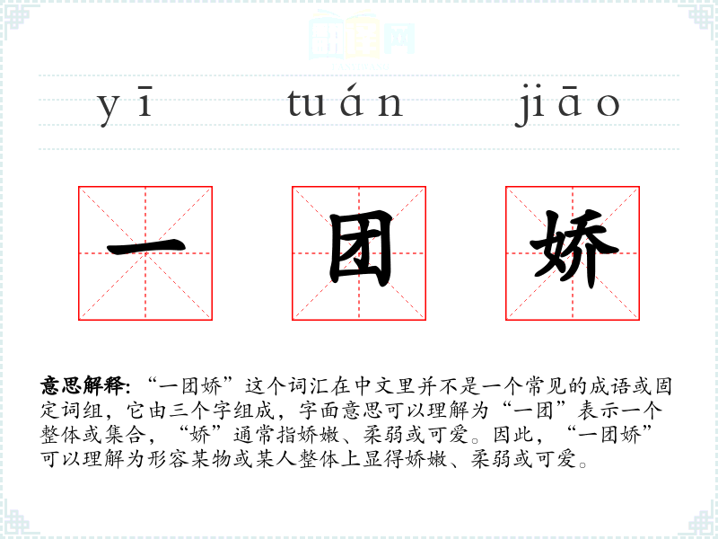 由于“一团娇”不是一个固定词汇,它的词源和演变没有具体的历史记录。字面上的“一团”和“娇”都是常用词汇,它们的组合可能是现代语言使用中的创新表达。