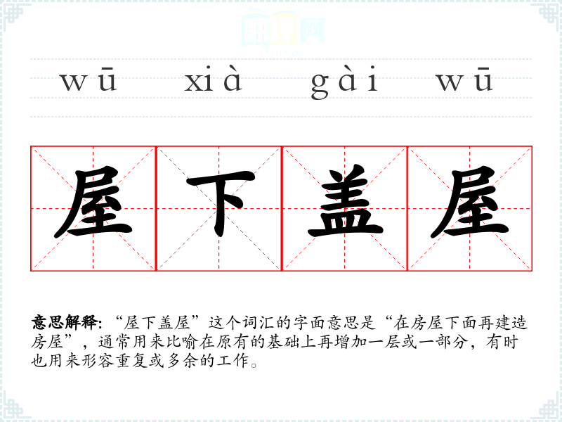“屋下盖屋”这个词汇的字面意思是“在房屋下面再建造房屋”,通常用来比喻在原有的基础上再增加一层或一部分,有时也用来形容重复或多余的工作。