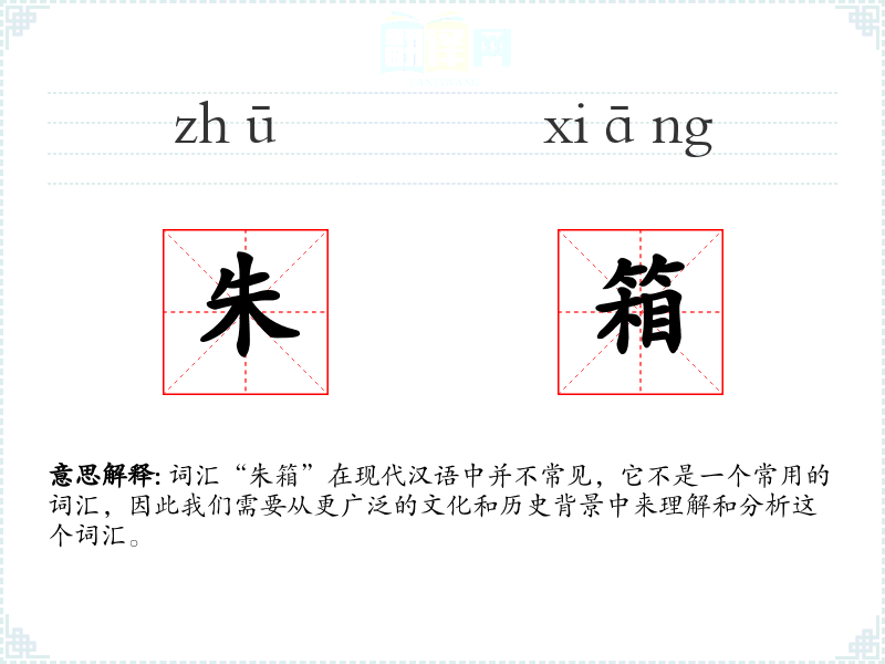 词汇“朱箱”在现代汉语中并不常见,它不是一个常用的词汇,因此我们需要从更广泛的文化和历史背景中来理解和分析这个词汇。