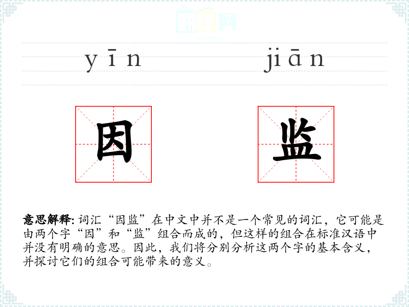 词汇“因监”在中文中并不是一个常见的词汇,它可能是由两个字“因”和“监”组合而成的,但这样的组合在标准汉语中并没有明确的意思。因此,我们将分别分析这两个字的基本含义,并探讨它们的组合可能带来的意义。