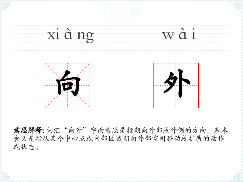 “向外”由“向”和“外”两个字组成。“向”字古汉语中已有朝向、方向之意,“外”字则指外部或外侧。这两个字组合起来,形成了描述朝向外部的复合词。