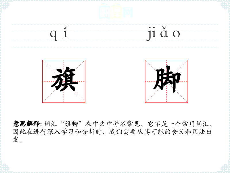 词汇“旗脚”在中文中并不常见,它不是一个常用词汇,因此在进行深入学*和分析时,我们需要从其可能的含义和用法出发。