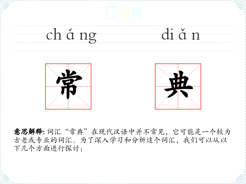 词汇“常典”在现代汉语中并不常见,它可能是一个较为古老或专业的词汇。为了深入学*和分析这个词汇,我们可以从以下几个方面进行探讨: