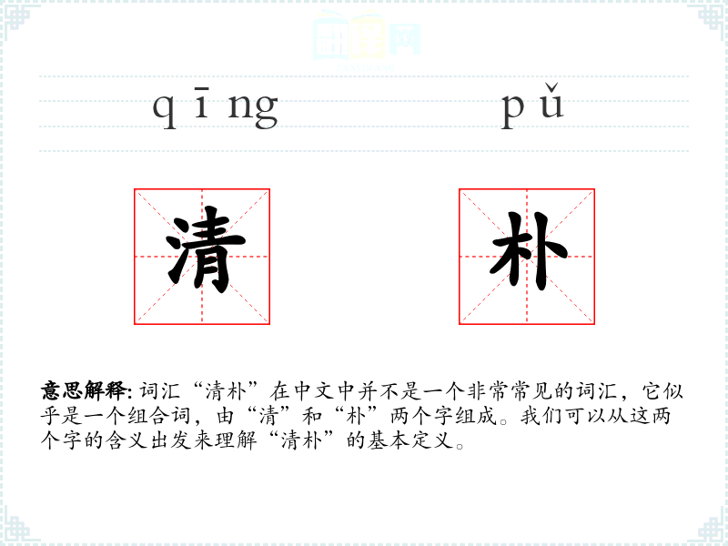 词汇“清朴”在中文中并不是一个非常常见的词汇,它似乎是一个组合词,由“清”和“朴”两个字组成。我们可以从这两个字的含义出发来理解“清朴”的基本定义。