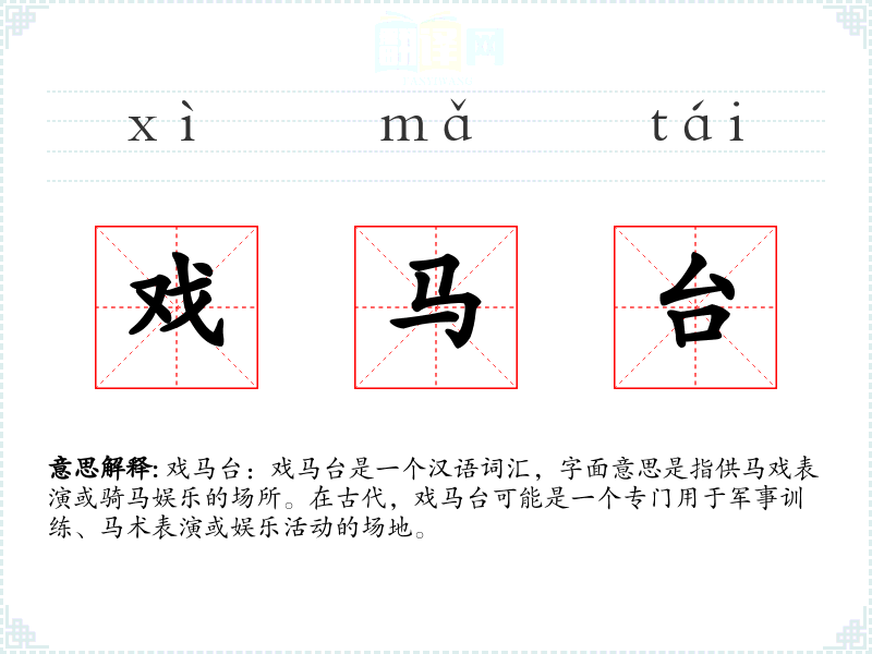 词源:戏马台的词源可能与古代的军事训练和娱乐活动有关,随着时间的推移,其含义逐渐扩展到泛指各种竞技和表演场所。