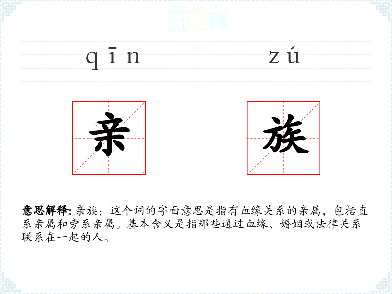 - 反义词:外人、陌生人。这些词与“亲族”形成对比,指的是没有血缘关系的人。