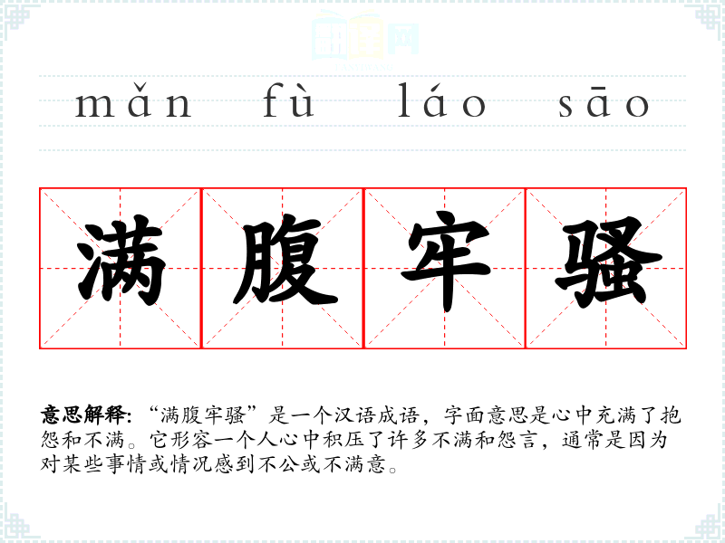 “满腹牢骚”是一个汉语成语,字面意思是心中充满了抱怨和不满。它形容一个人心中积压了许多不满和怨言,通常是因为对某些事情或情况感到不公或不满意。