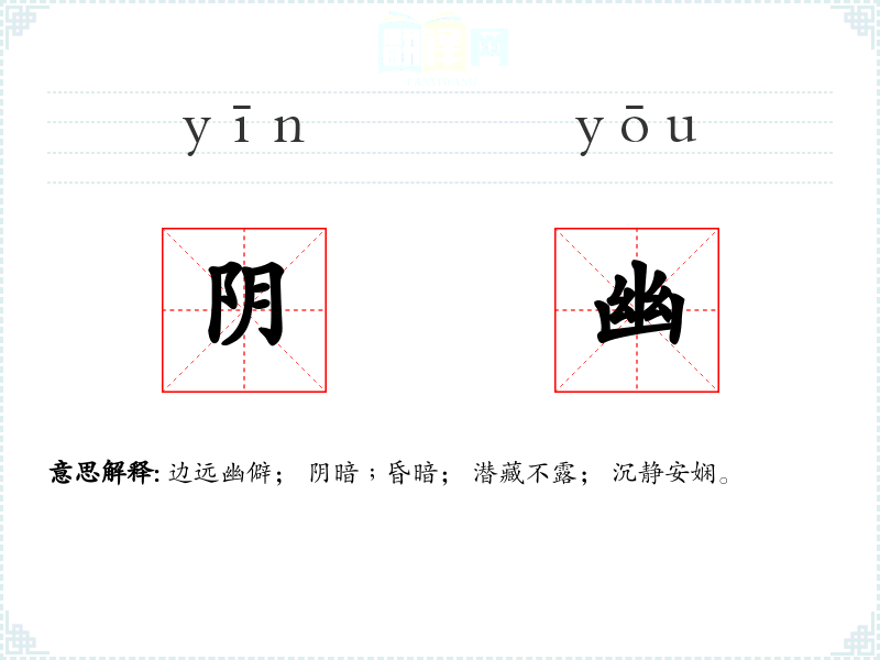 边远幽僻; 阴暗﹔昏暗; 潜藏不露; 沉静安娴。