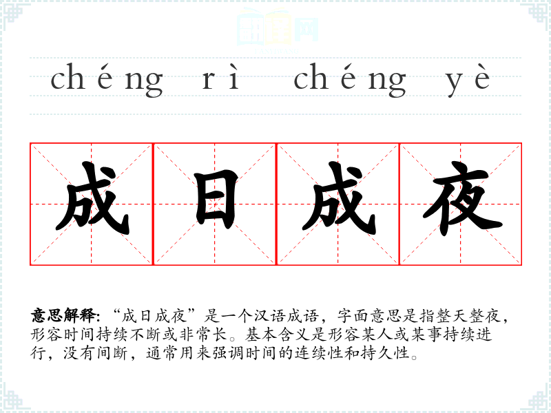 “成日成夜”是一个汉语成语,字面意思是指整天整夜,形容时间持续不断或非常长。基本含义是形容某人或某事持续进行,没有间断,通常用来强调时间的连续性和持久性。
