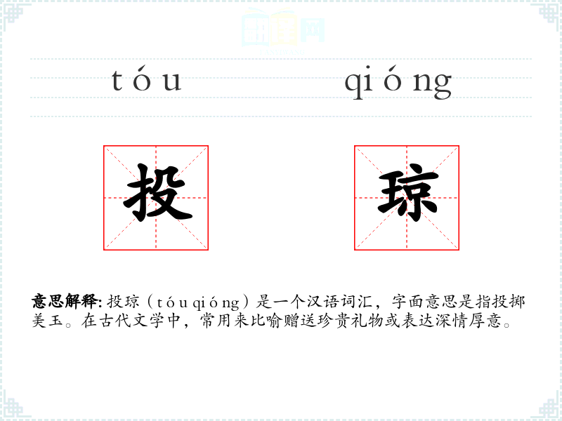 投琼(tóu qióng)是一个汉语词汇,字面意思是指投掷美玉。在古代文学中,常用来比喻赠送珍贵礼物或表达深情厚意。