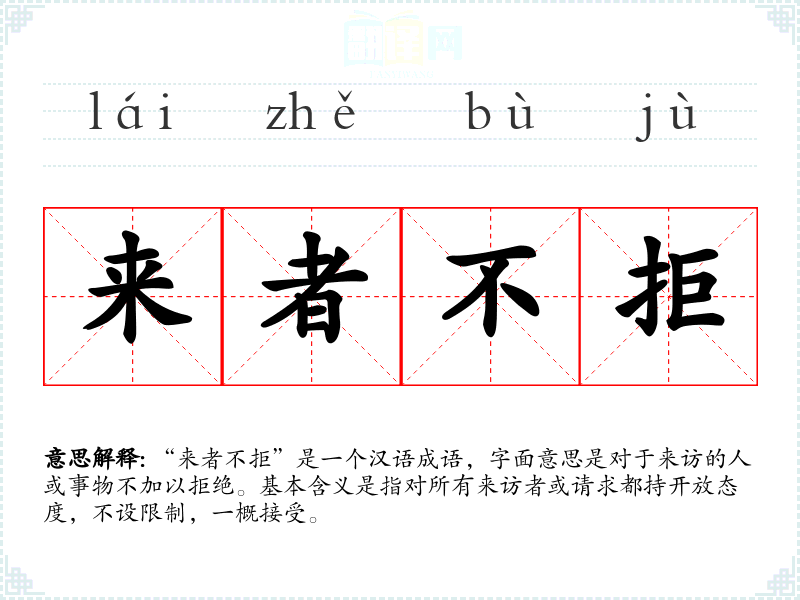 “来者不拒”是一个汉语成语,字面意思是对于来访的人或事物不加以拒绝。基本含义是指对所有来访者或请求都持开放态度,不设限制,一概接受。