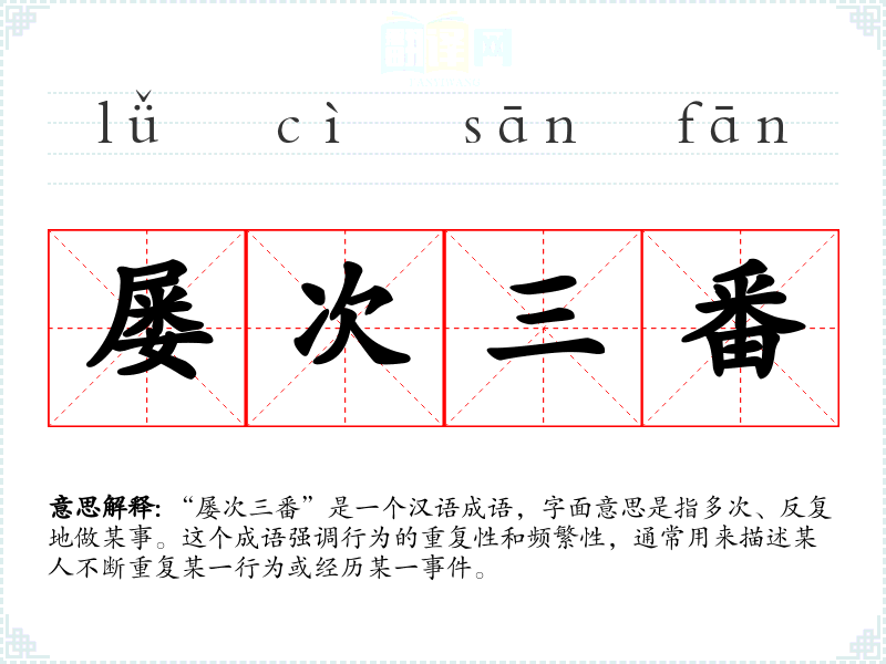 “屡次三番”是一个汉语成语,字面意思是指多次、反复地做某事。这个成语强调行为的重复性和频繁性,通常用来描述某人不断重复某一行为或经历某一**。