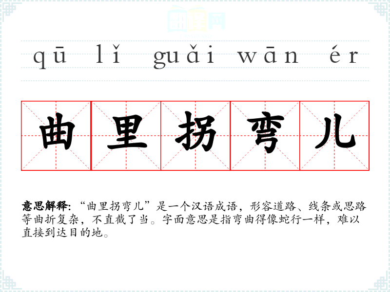 “曲里拐弯儿”是一个汉语成语,形容道路、线条或思路等曲折复杂,不直截了当。字面意思是指弯曲得像蛇行一样,难以直接到达目的地。
