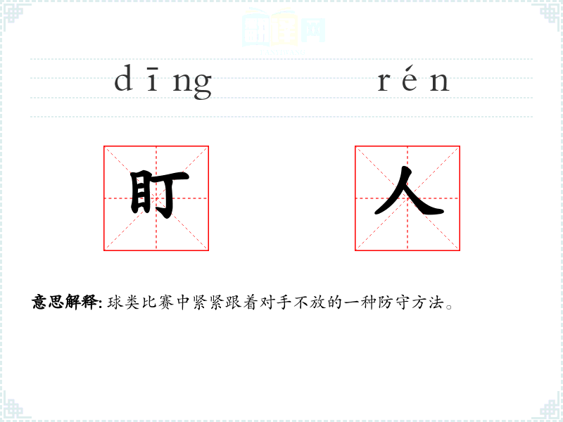 球类比赛中紧紧跟着对手不放的一种防守方法。