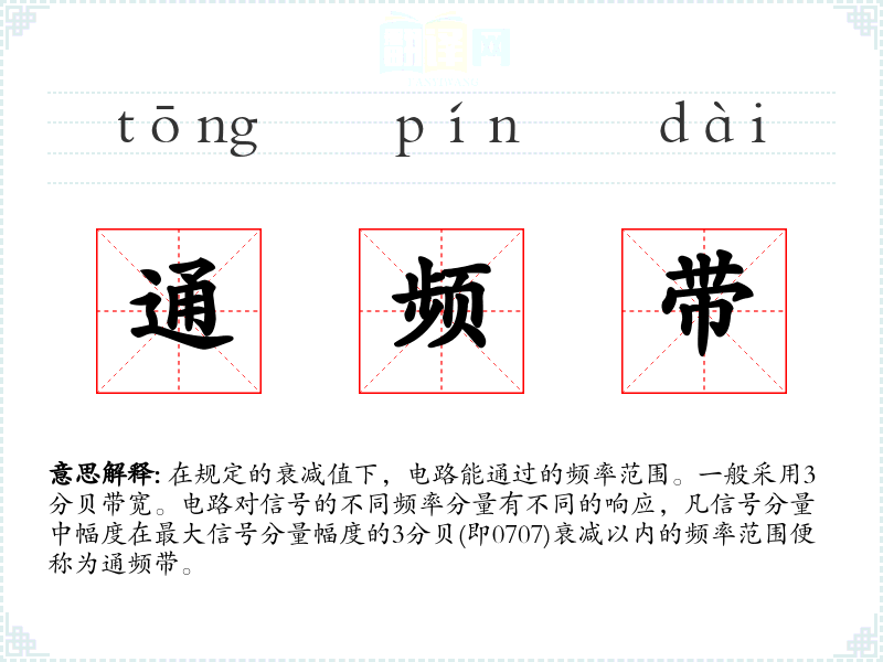 在规定的衰减值下,电路能通过的频率范围。一般采用3分贝带宽。电路对信号的不同频率分量有不同的响应,凡信号分量中幅度在最大信号分量幅度的3分贝(即0707)衰减以内的频率范围便称为通频带。
