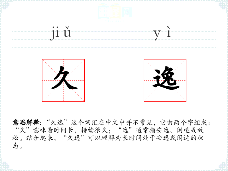 “久逸”这个词汇在中文中并不常见,它由两个字组成:“久”意味着时间长,持续很久;“逸”通常指安逸、闲适或放松。结合起来,“久逸”可以理解为长时间处于安逸或闲适的状态。