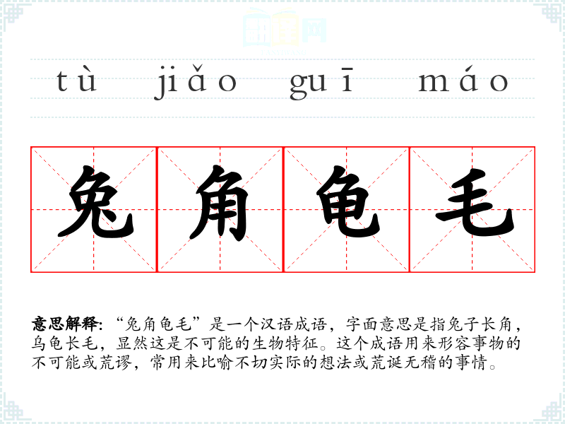“兔角龟毛”是一个汉语成语,字面意思是指兔子长角,乌龟长毛,显然这是不可能的生物特征。这个成语用来形容事物的不可能或荒谬,常用来比喻不切实际的想法或荒诞无稽的事情。